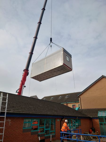 The unit was 60min fire rated throughout, with a finish external finish of Cedral cladding. The unit was located in small courtyard and had to be craned (by Bryan Thomas) over other buildings during a weekend install